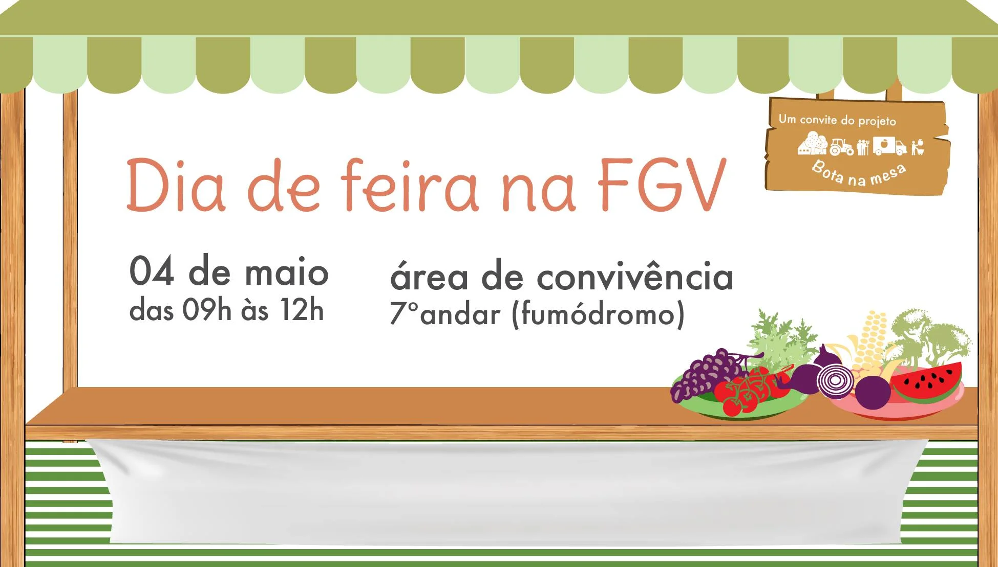 Você já parou para pensar nos caminhos que trazem os alimentos saudáveis até nós, consumidores? Com o objetivo de encurtar essa distância, o projeto Bota na Mesa, realizado pelo GVces, convida funcionários, professores e alunos da FGV para fazer a feira! Nove cooperativas e associações de agricultores familiares trarão para a FGV suas frutas, legumes e verduras. Participe!